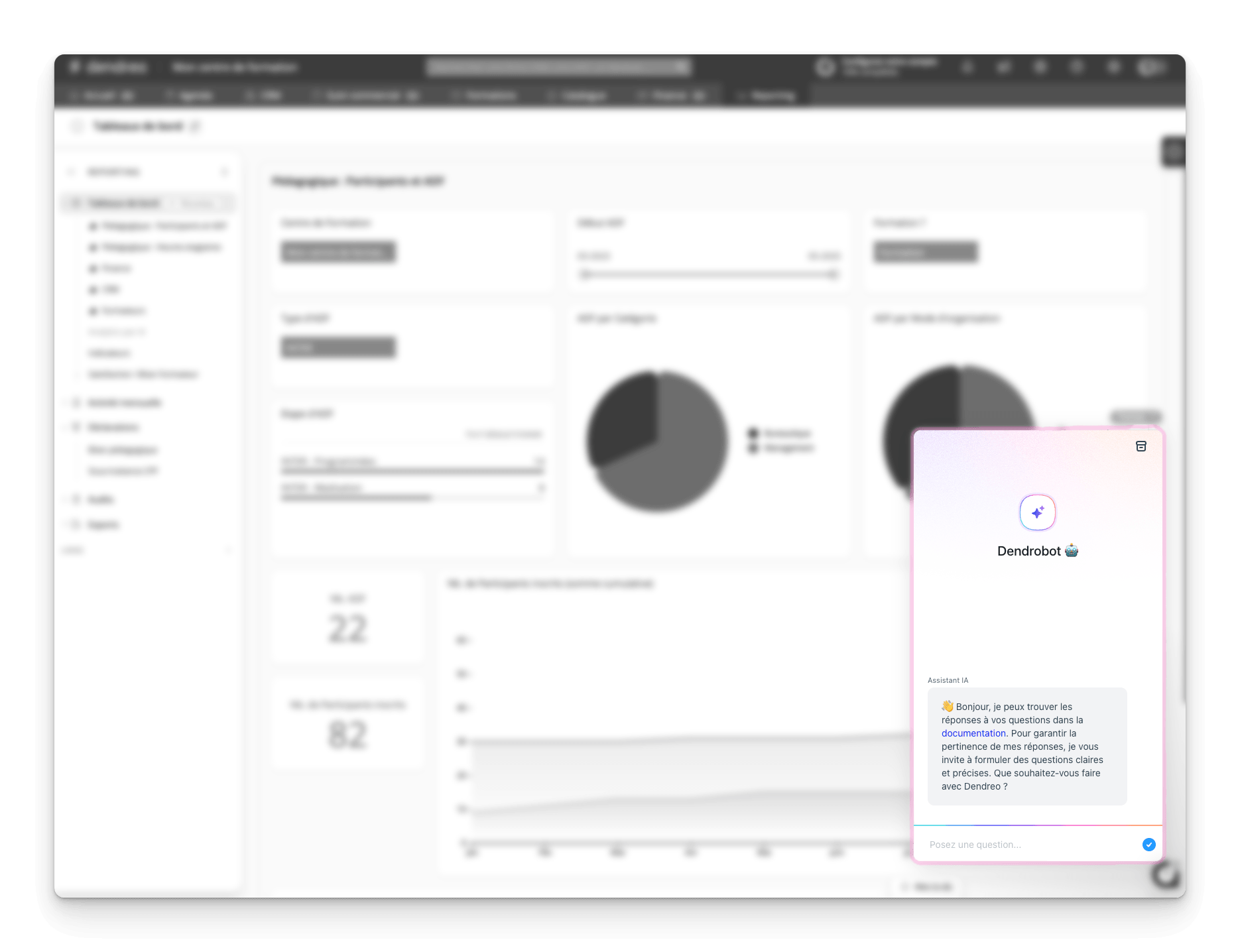 Accessible en un clic depuis n'importe quelle page de Dendreo, DendroBot est un assistant conversationnel propulsé par l'intelligence artificielle. Il comprend vos questions en langage naturel et vous apporte une réponse claire, sourcée et contextualisée en quelques secondes.