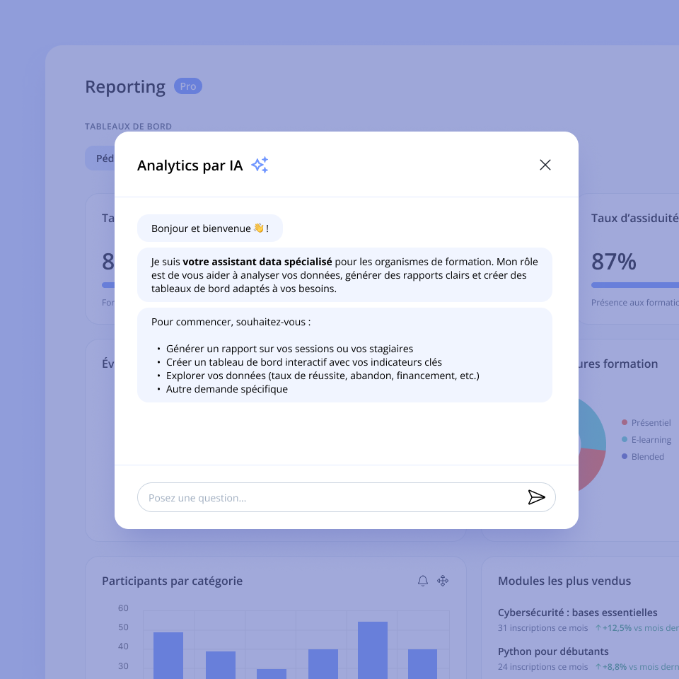 Interrogez vos données simplement. Demandez "Quelle est la note moyenne par formateur ce trimestre ?" et obtenez instantanément le graphique correspondant.