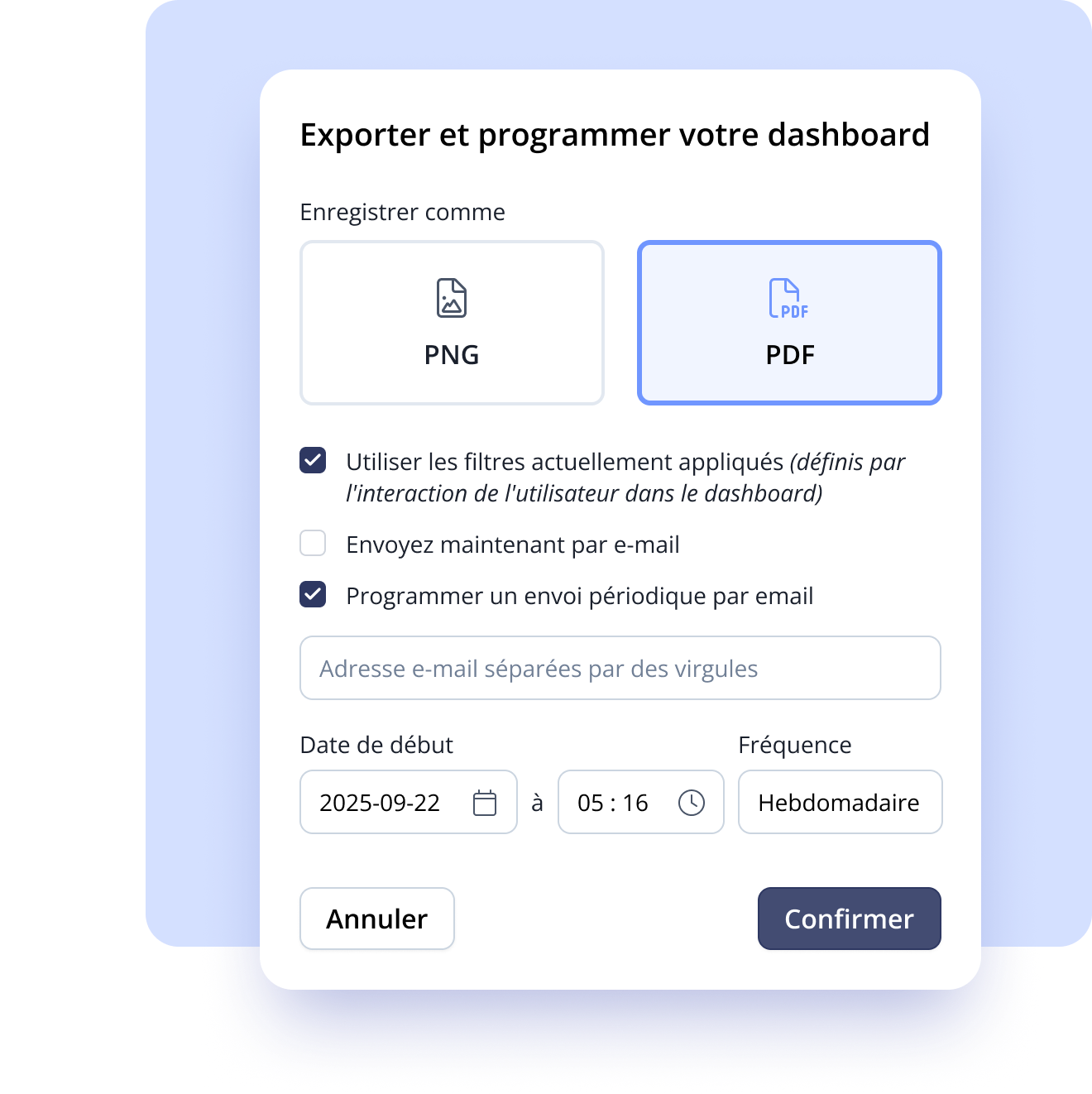 Fluidifiez la communication interne. Programmez l'envoi de rapports (PDF) récurrents à vos parties prenantes.